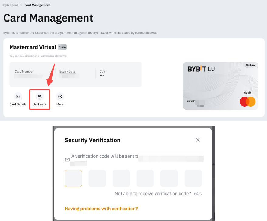 To reactivate your Bybit Card, click on Unfreeze and complete the security verification to confirm the action.