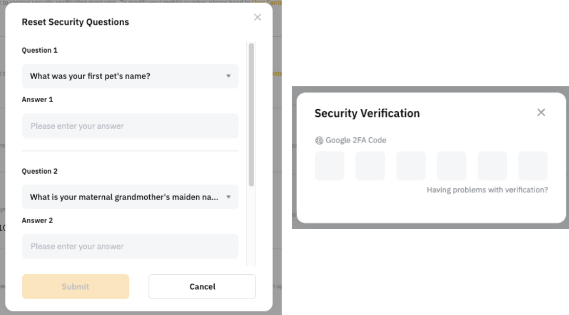 Step 3: Select three (3) security questions and key in the answers, then click on Submit and enter the Google Authenticator code to confirm your action. Please note that the answers you enter are case-sensitive.
