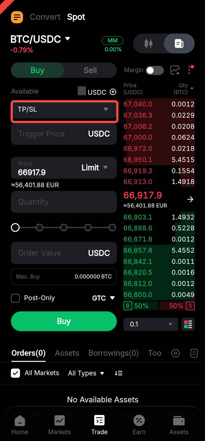 You can set the trigger price, order price (Limit order), and order quantity to the TP/SL order. The assets will be occupied at the time when the TP/SL order is placed. Once the last traded price reaches the preset trigger price, a Limit or Market order will be placed according to the present order parameters.