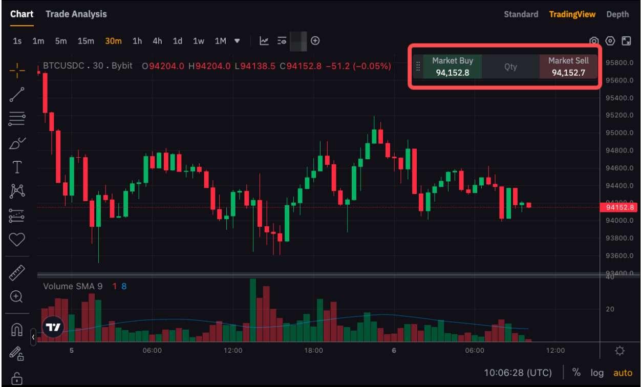 The Quick Open market order is located at the upper right corner of the trading chart. Once traders have preset the quantity of the contracts, they will be able to open a buy or sell position using a market order with just one click.