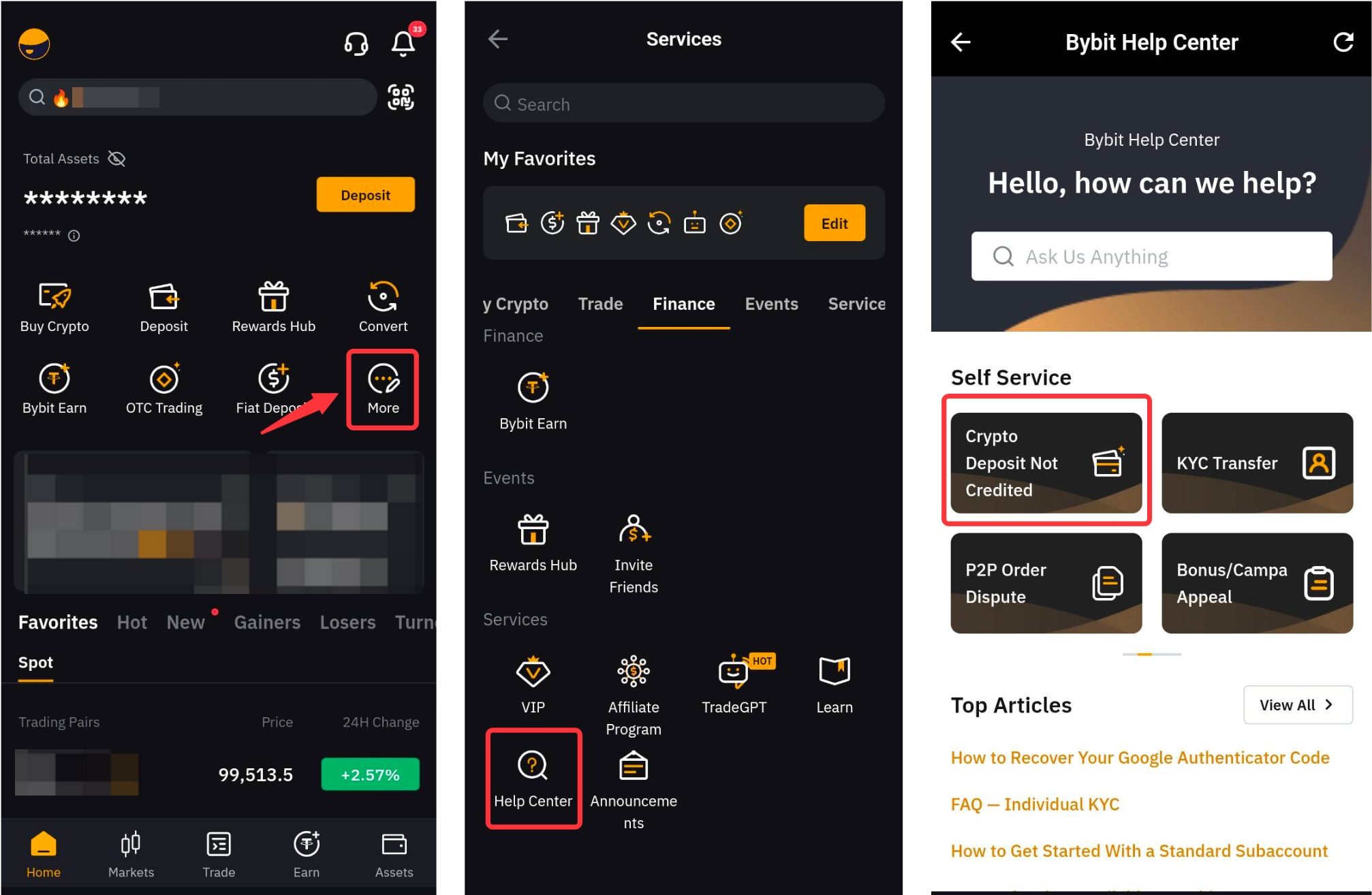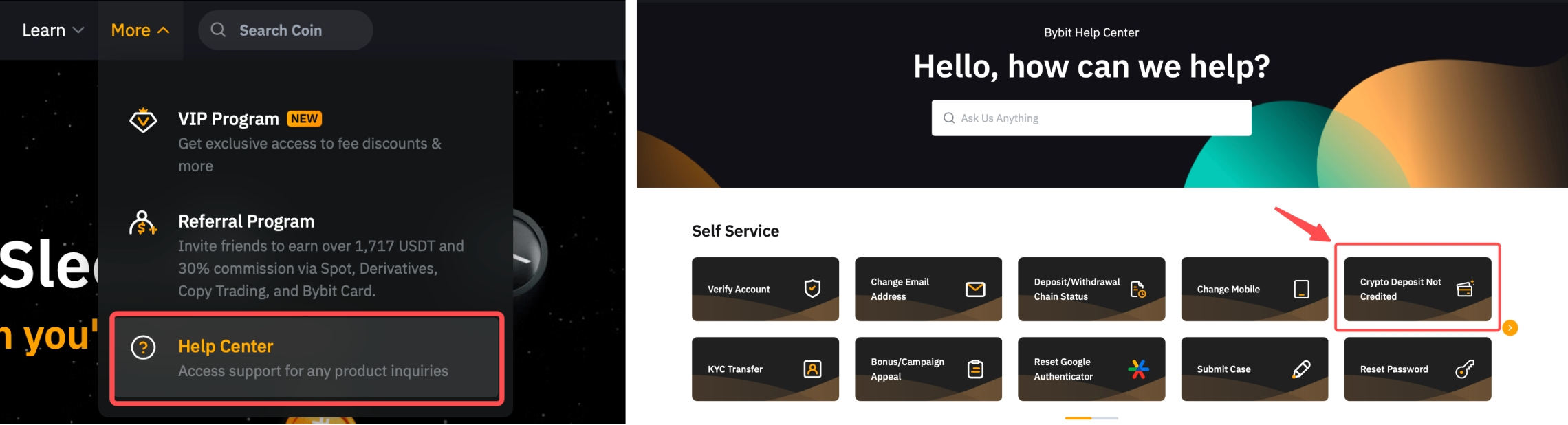 Step 1: Hover to the upper left corner to look for Help Center → Select Crypto Deposit not credited, and you will be redirected to the Self-Service page.