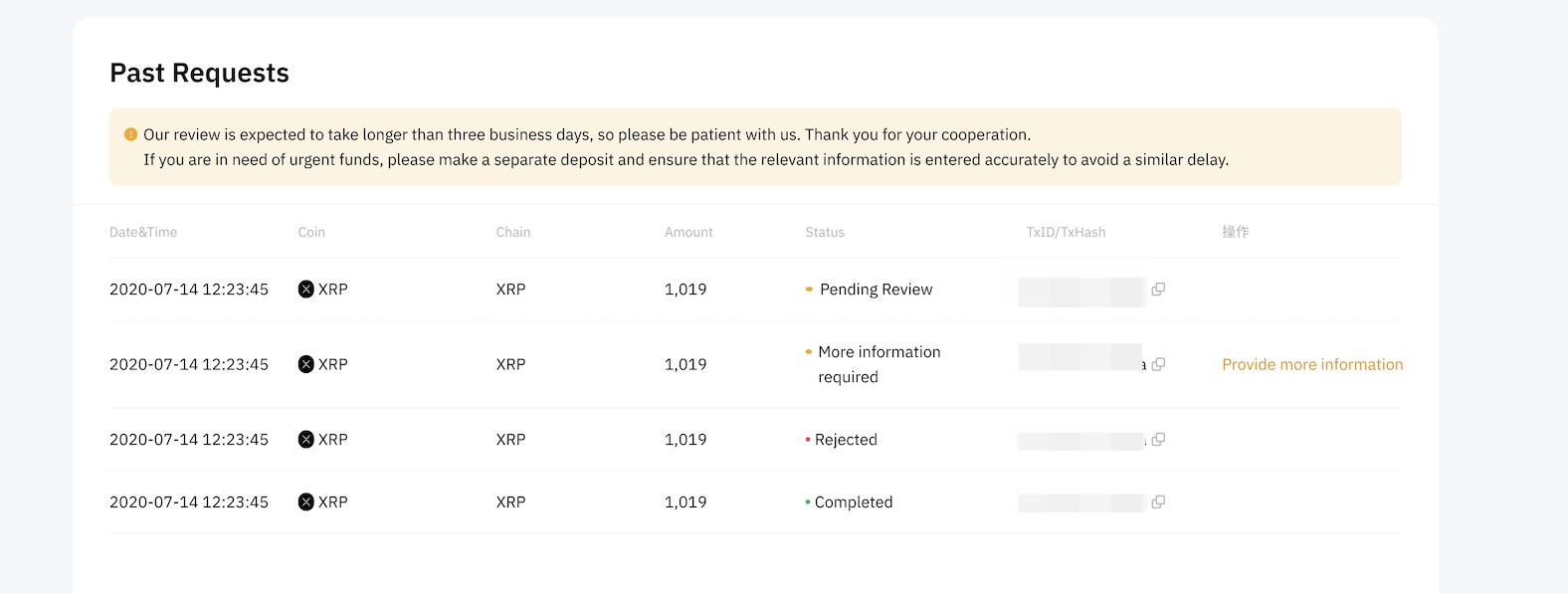 No Return TXID | Please follow the instructions and show us the complete return TXID by clicking into the blockchain redirection link if Exchange A only provides a link. If the TXID was obtained only through communication with Exchange A, such as a chat history with their customer support, refund details provided via email or SMS, or via a self-service application, please provide us with the record of the conversation. |