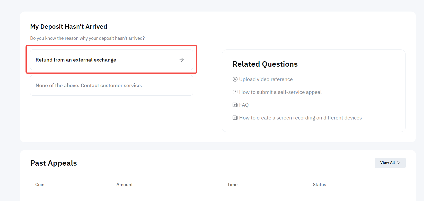 Step 2: Select the reason why your deposit has not arrived: Refund from an external exchange.